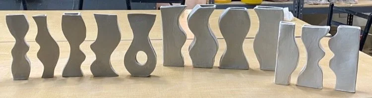 A woman with gray hair, glasses, and a black jacket standing indoors beside a display table with ceramic art pieces. Outside the window is a snowy landscape with trees and parked cars.